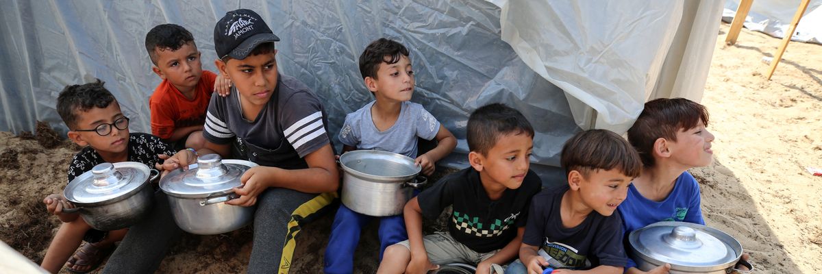 İsrail bombardımanı nedeniyle yerlerinden edilen çocuklar 24 Ekim 2023 tarihinde Gazze’nin güneyindeki bir UNRWA tesisinde yiyecek almak için beklerken [Fotoğraf: Majdi Fathi/NurPhoto]